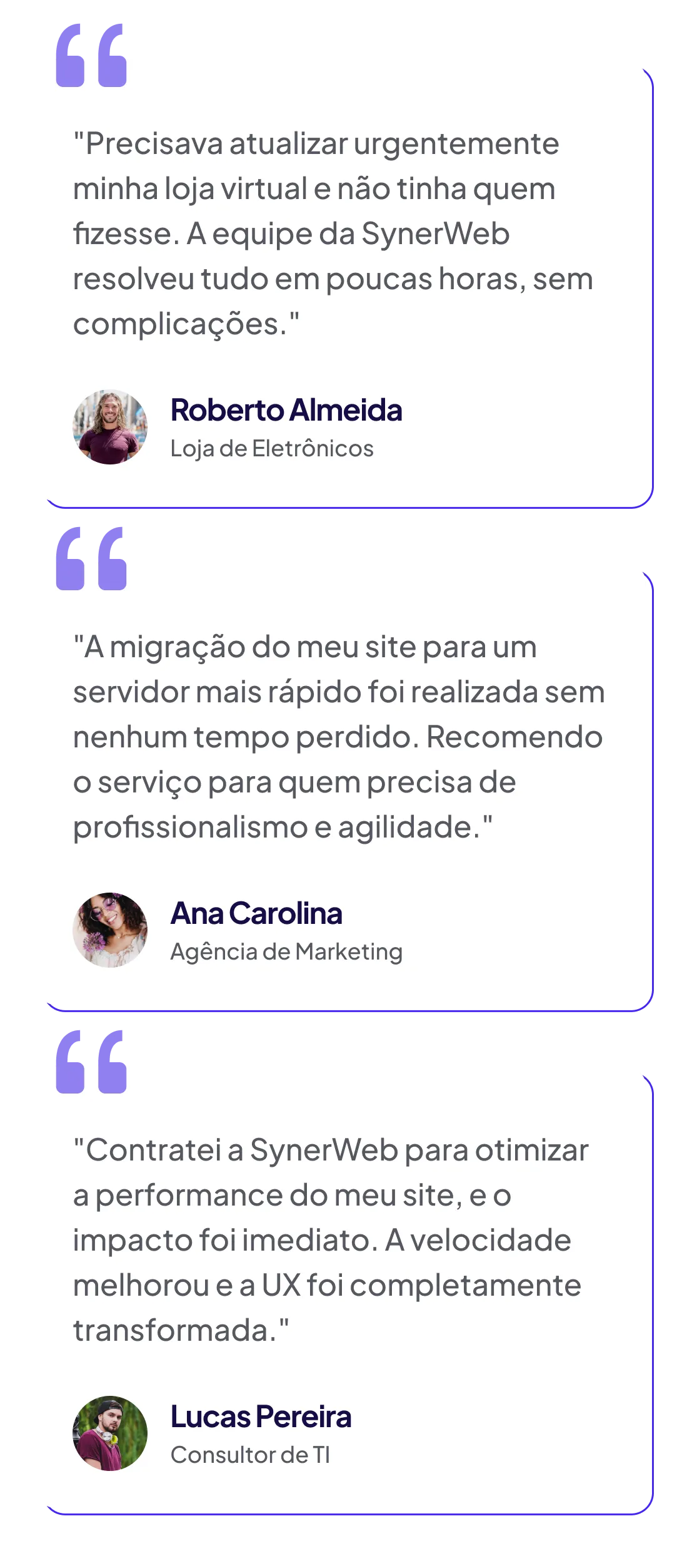 “Contratei a SynerWeb para otimizar a performance do meu site, e o impacto foi imediato. A velocidade melhorou e a UX foi completamente transformada.”